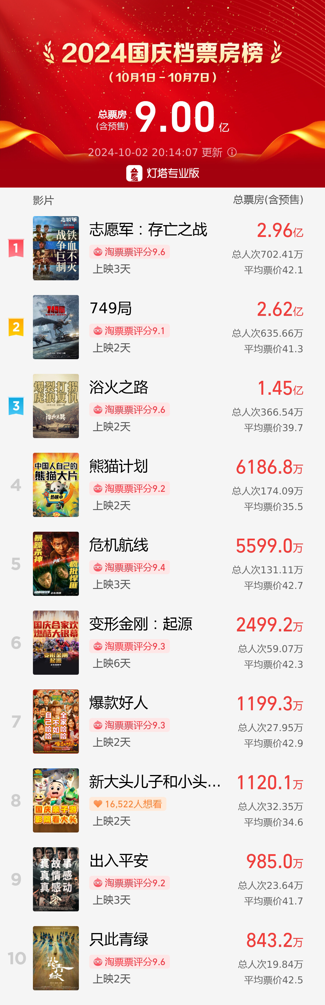 据荟萃平台数据,限度10月2日20时14分,2024年国庆档(10月1日—10月7日)档期内总票房(含预售)冲突9亿。