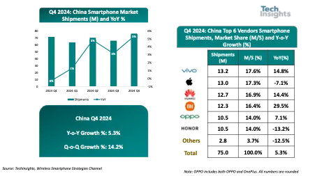 2024年Q4中国智妙手机阛阓增长5% 苹果份额四年新低